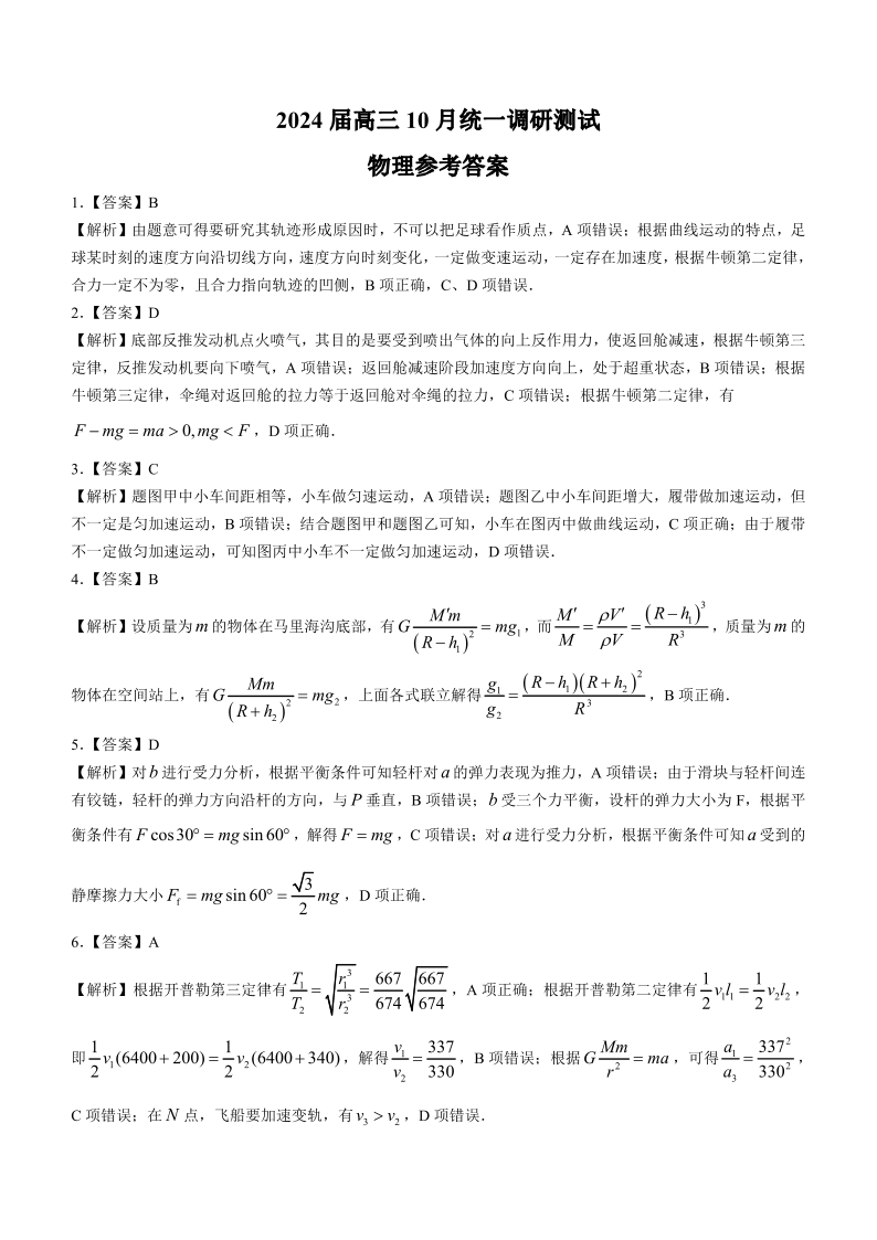 江西省稳派联考2023-2024学年高三上学期10月统一调研测试 物理答案