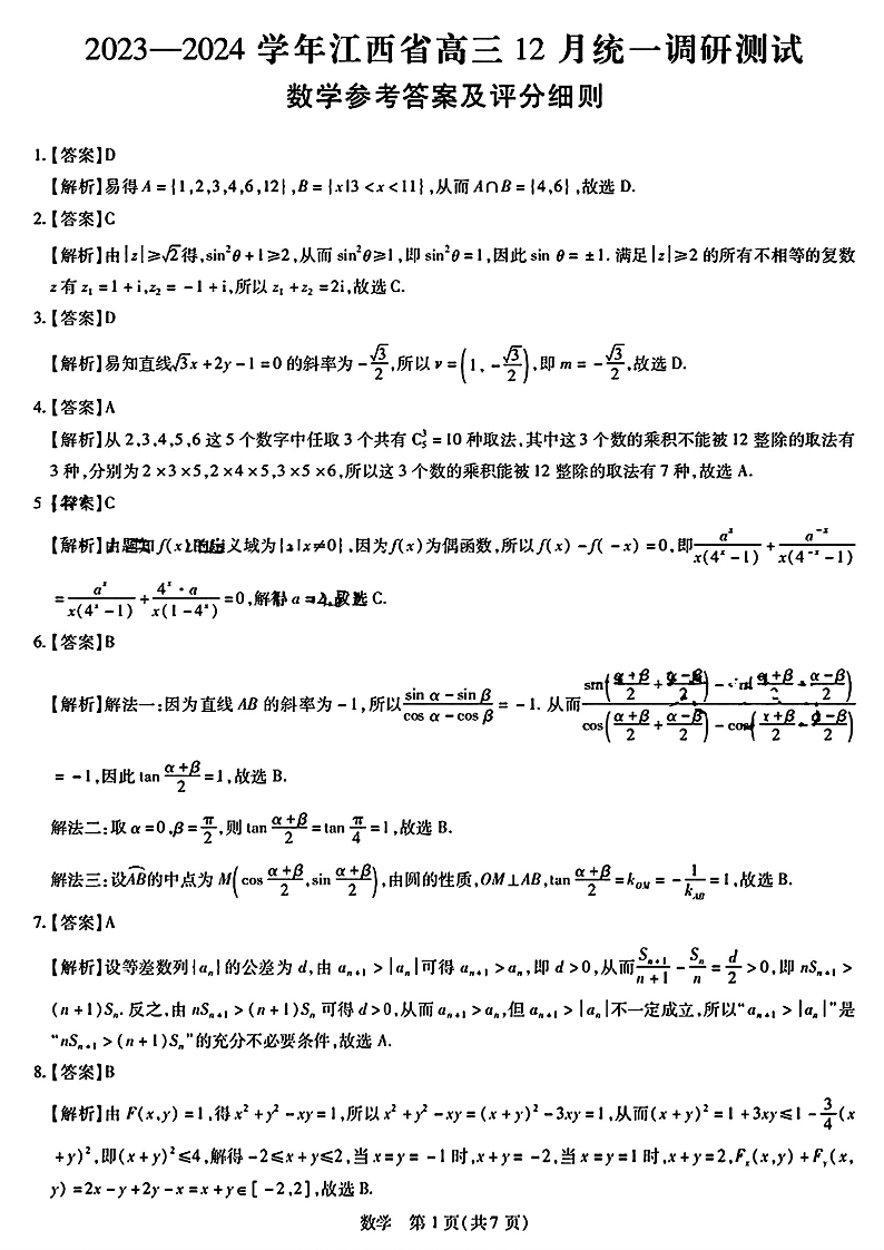 江西省2023-2024学年高三上学期12月统一调研测试 数学答案