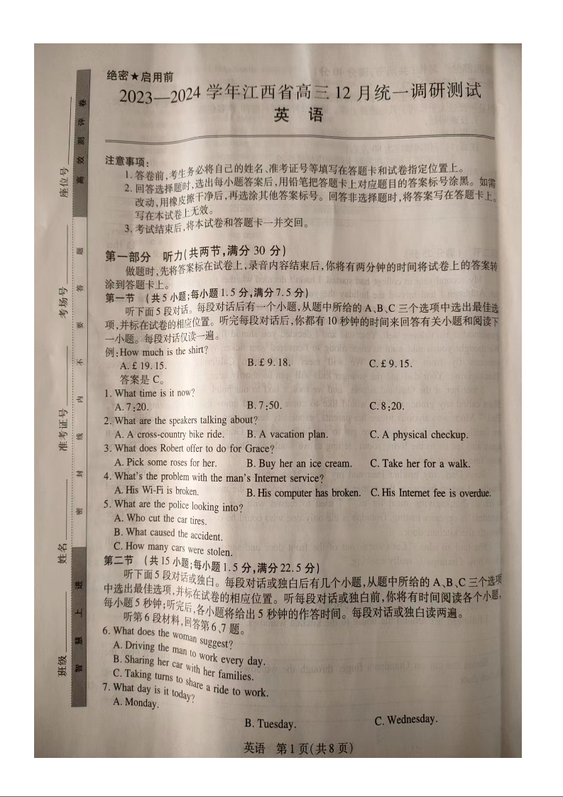 江西省2023-2024学年高三上学期12月统一调研测试 英语
