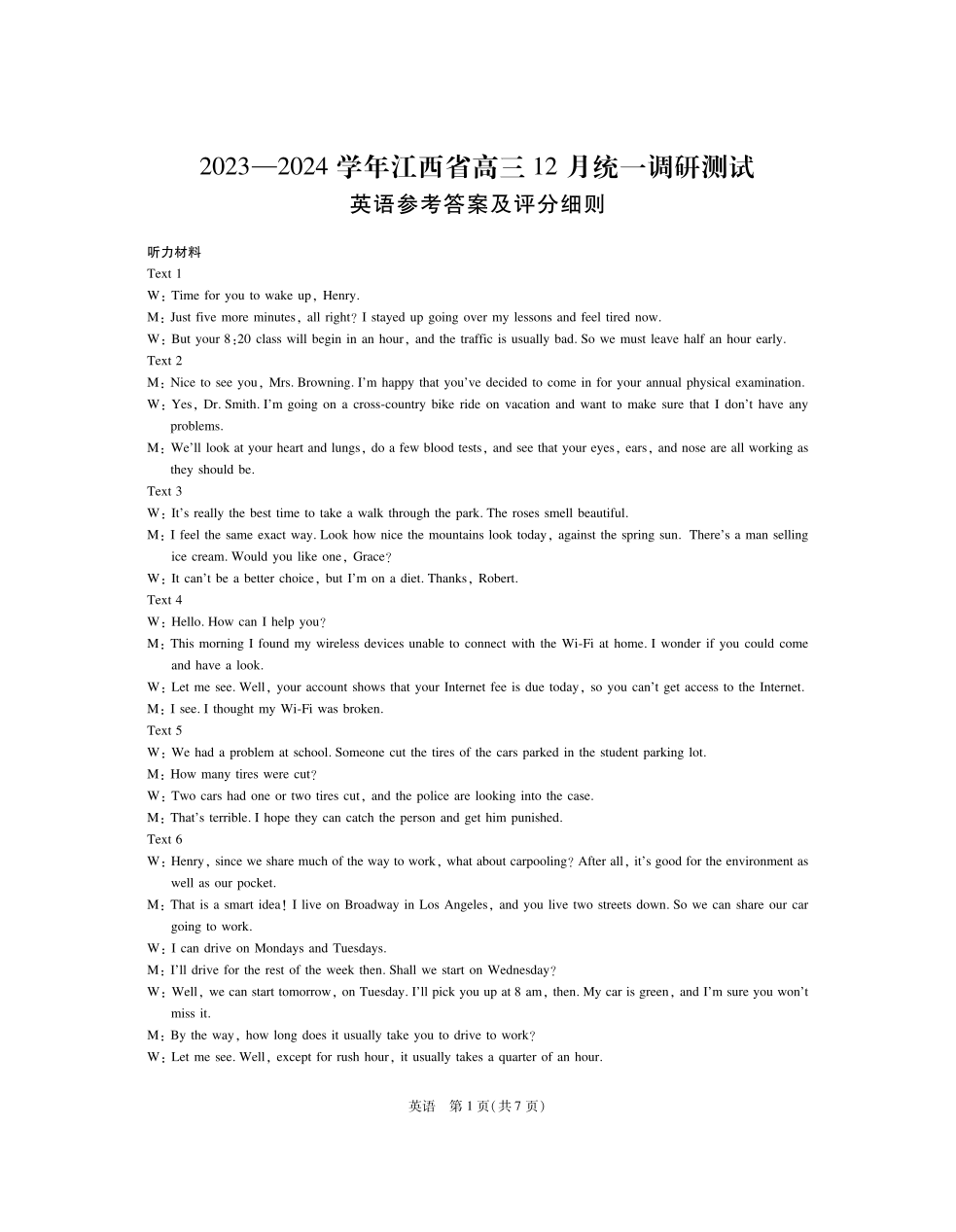 江西省2023-2024学年高三上学期12月统一调研测试 英语答案