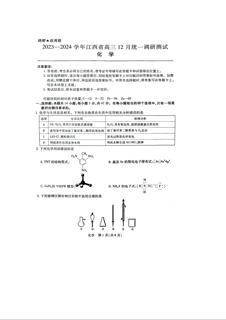 江西省2023-2024学年高三上学期12月统一调研测试 化学