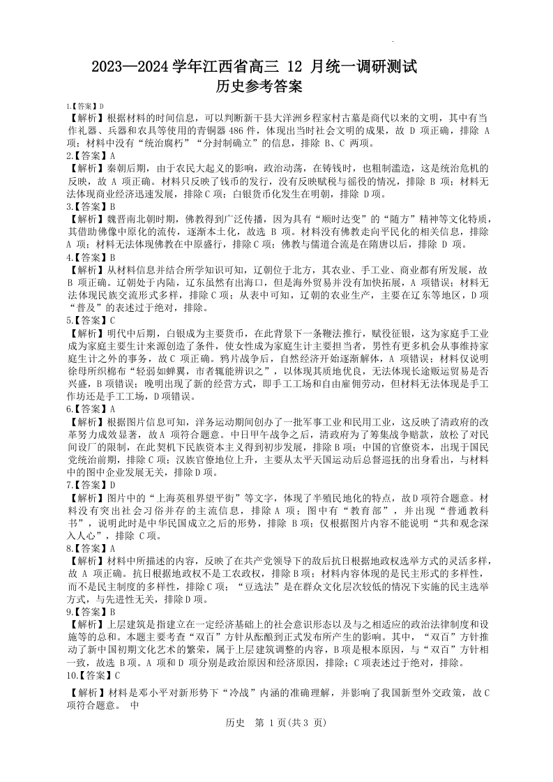 江西省2023-2024学年高三上学期12月统一调研测试 历史答案