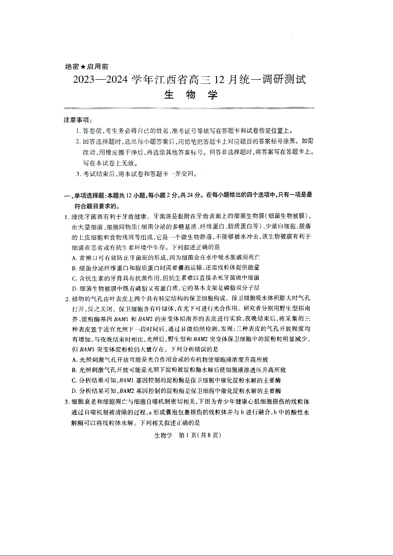 江西省2023-2024学年高三上学期12月统一调研测试 生物