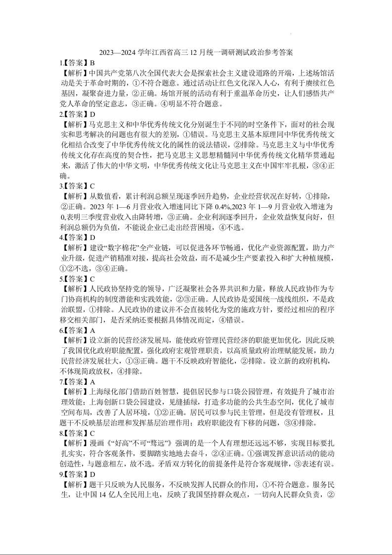 江西省2023-2024学年高三上学期12月统一调研测试 政治答案