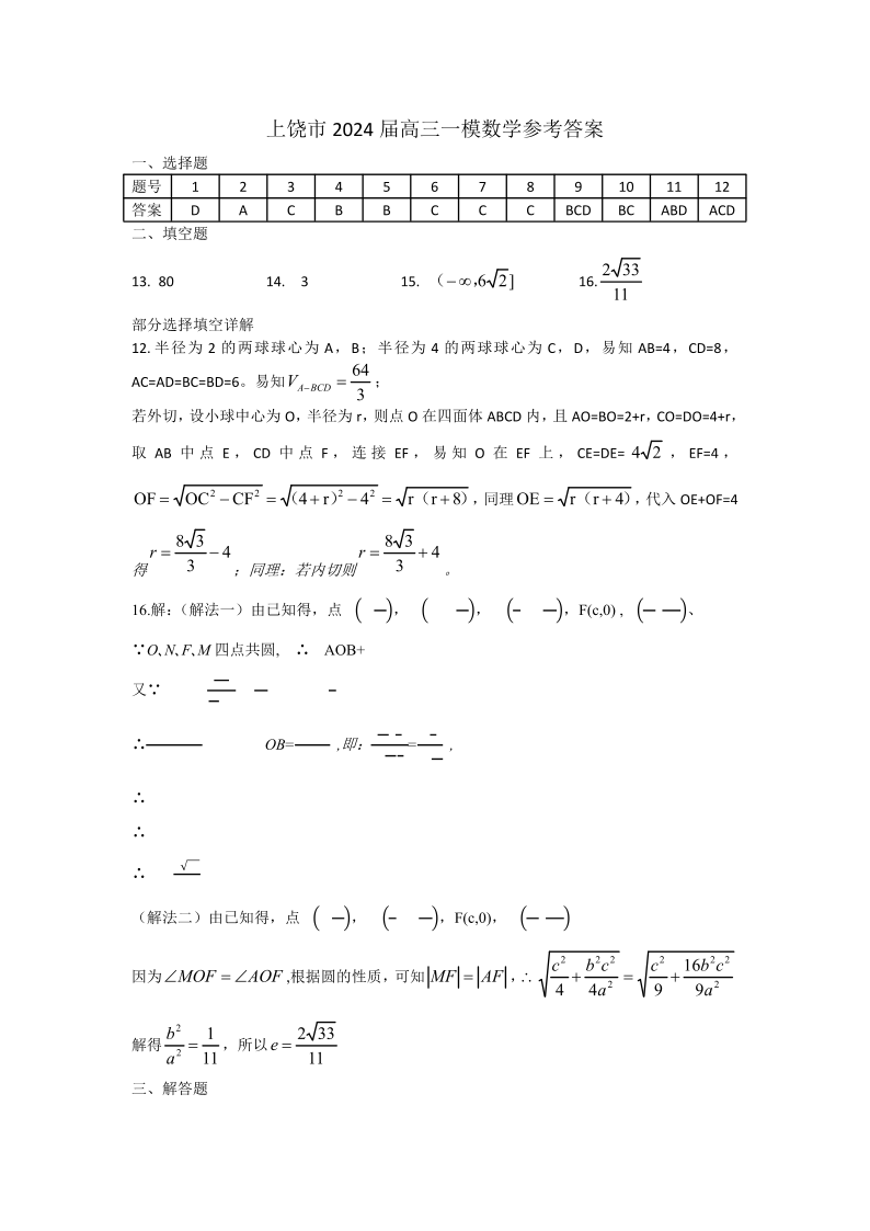 江西省上饶市2024届高三下学期第一次高考模拟考试 数学答案