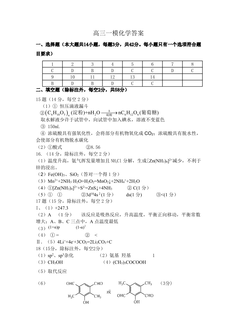 江西省上饶市2024届高三下学期第一次高考模拟考试 化学答案