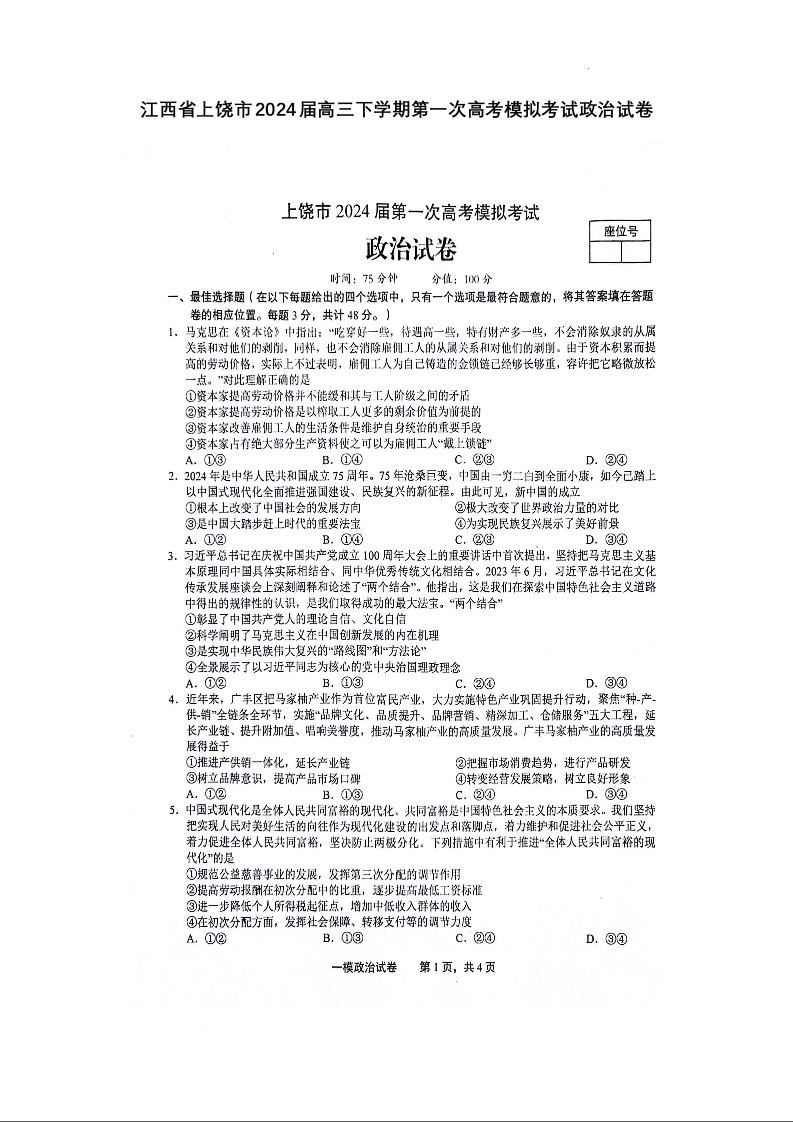 江西省上饶市2024届高三下学期第一次高考模拟考试 政治