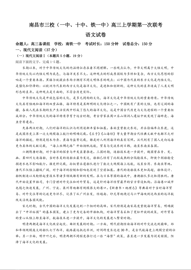 江西省南昌市三校(南昌市第一中学、南昌市铁路第一中学、南昌市第十中学)2023-2024学年高三上学期第一次联考 语文