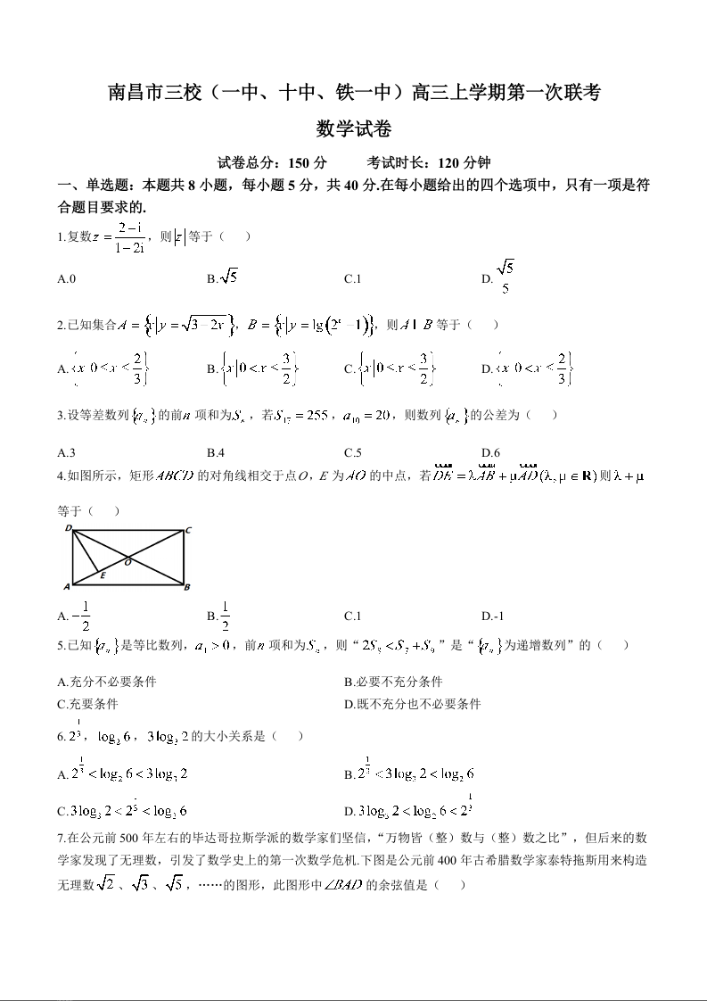 江西省南昌市三校(南昌市第一中学、南昌市铁路第一中学、南昌市第十中学)2023-2024学年高三上学期第一次联考 数学