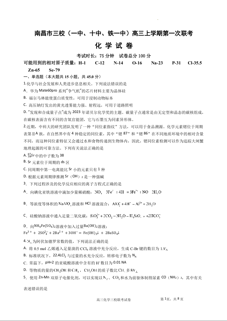 江西省南昌市三校(南昌市第一中学、南昌市铁路第一中学、南昌市第十中学)2023-2024学年高三上学期第一次联考 化学