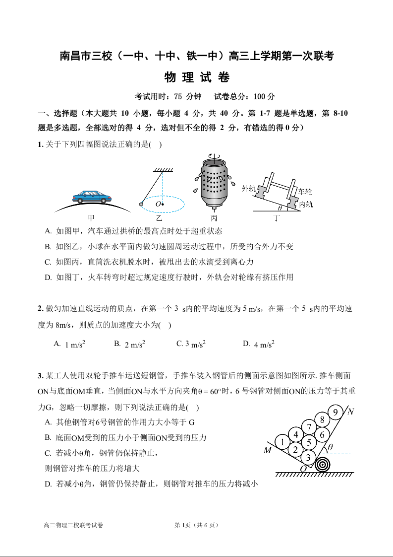 江西省南昌市三校(南昌市第一中学、南昌市铁路第一中学、南昌市第十中学)2023-2024学年高三上学期第一次联考 物理