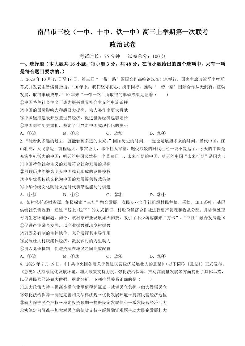 江西省南昌市三校(南昌市第一中学、南昌市铁路第一中学、南昌市第十中学)2023-2024学年高三上学期第一次联考 政治