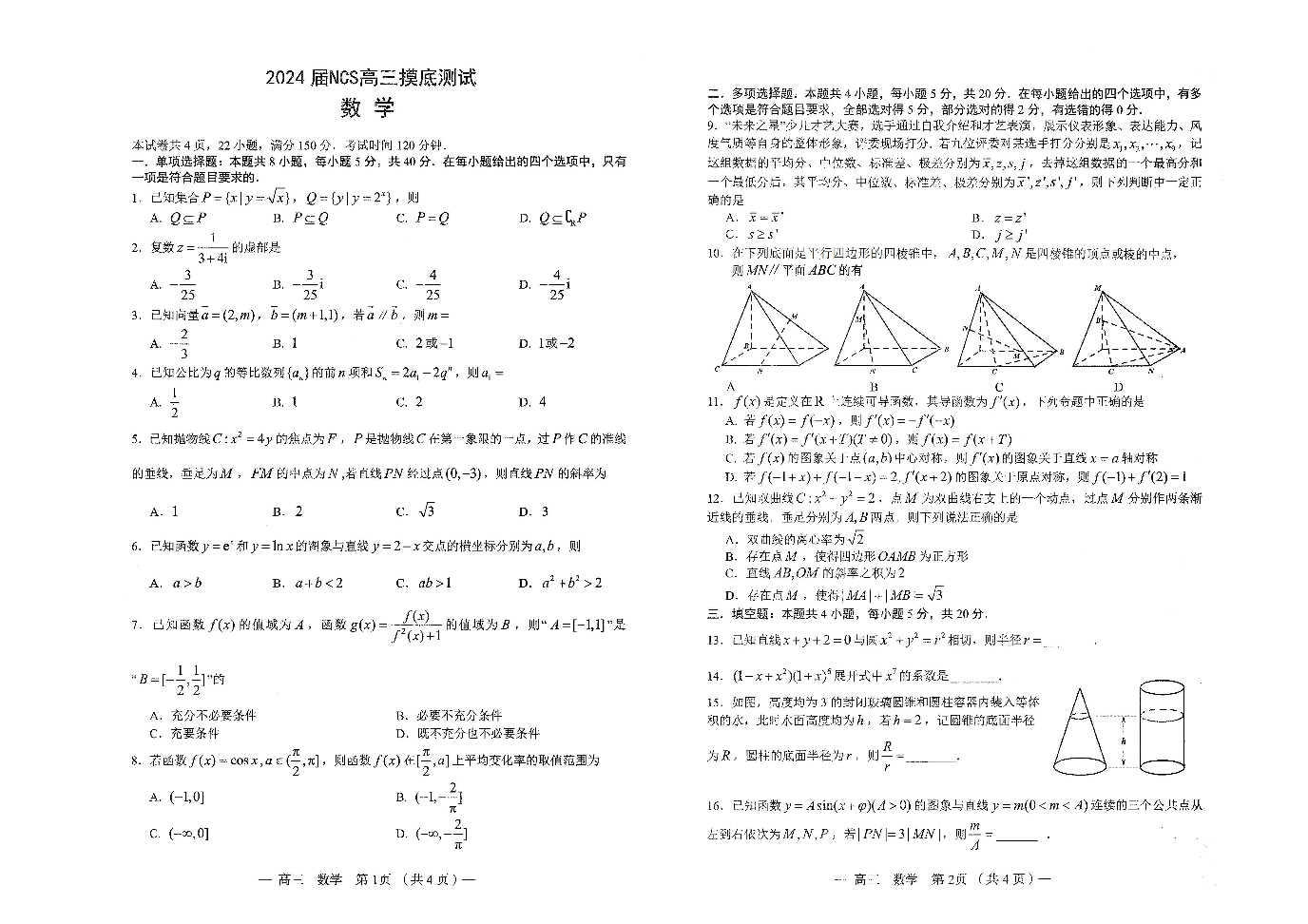 江西省南昌市2023-2024学年高三上学期开学考试(南昌零模) 数学