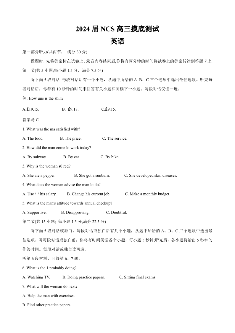 江西省南昌市2023-2024学年高三上学期开学考试(南昌零模) 英语