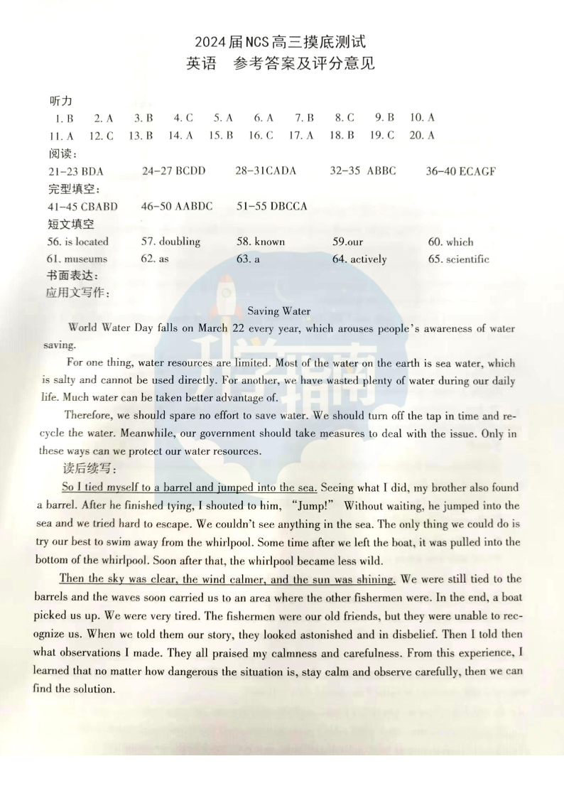 江西省南昌市2023-2024学年高三上学期开学考试(南昌零模) 英语答案