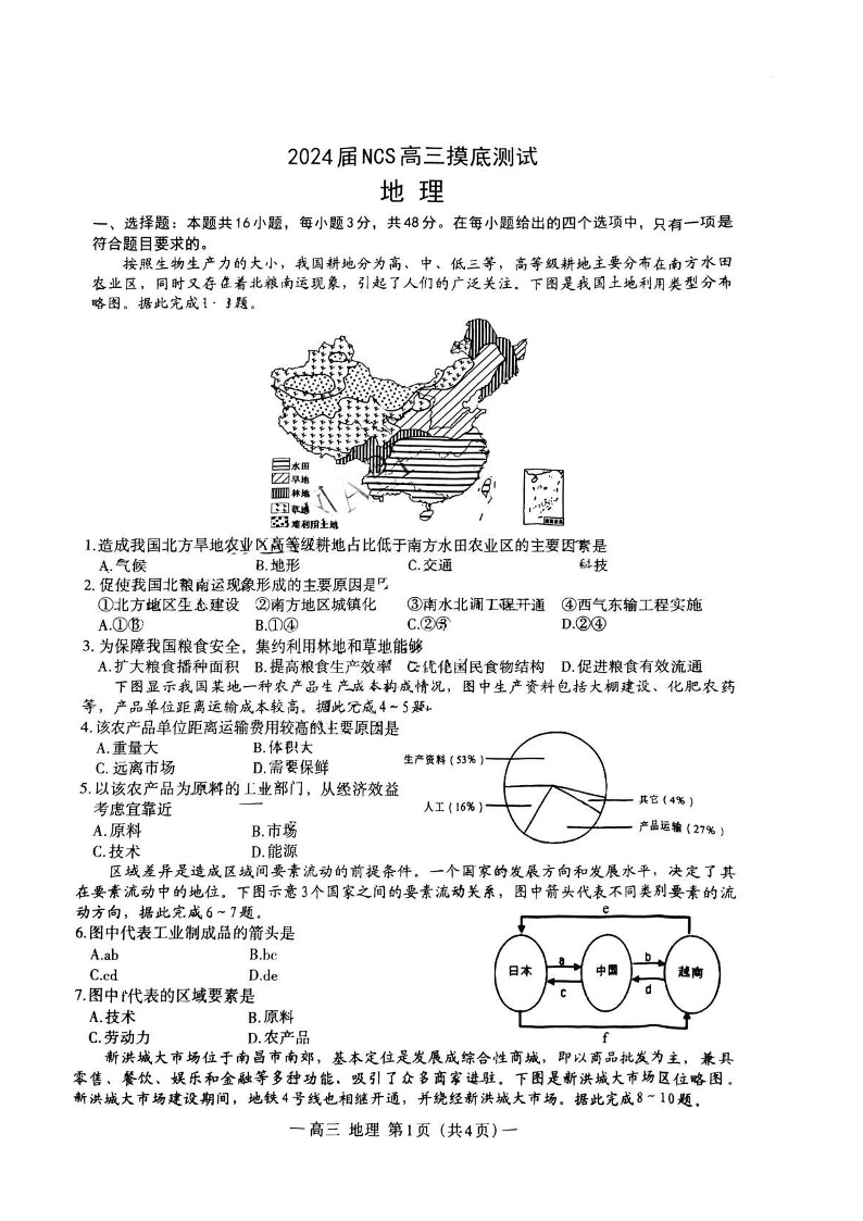江西省南昌市2023-2024学年高三上学期开学考试(南昌零模) 地理