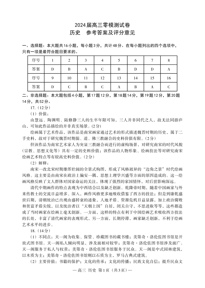 江西省南昌市2023-2024学年高三上学期开学考试(南昌零模) 历史答案