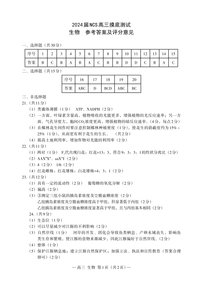 江西省南昌市2023-2024学年高三上学期开学考试(南昌零模) 生物答案