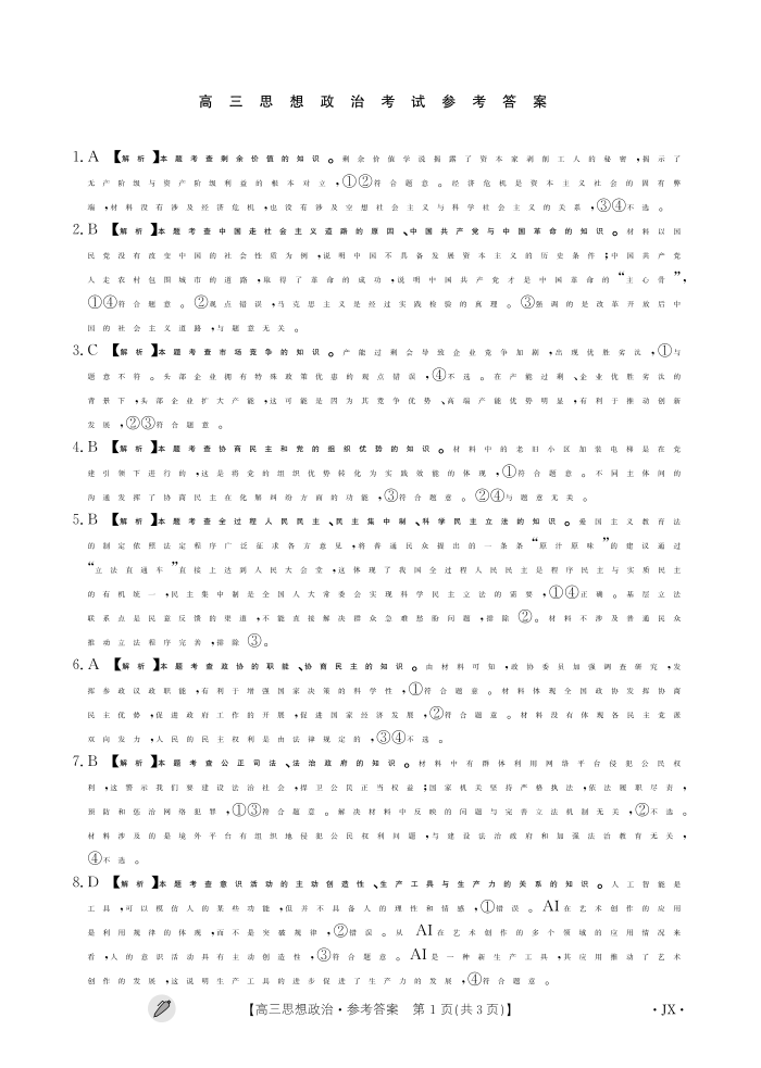 江西省九江市同文中学多校联考2024届高三下学期3月月考 政治答案