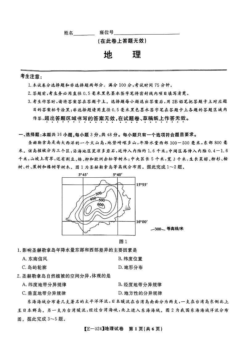 江西省九江市十校2023-2024学年高三第二次联考 地理