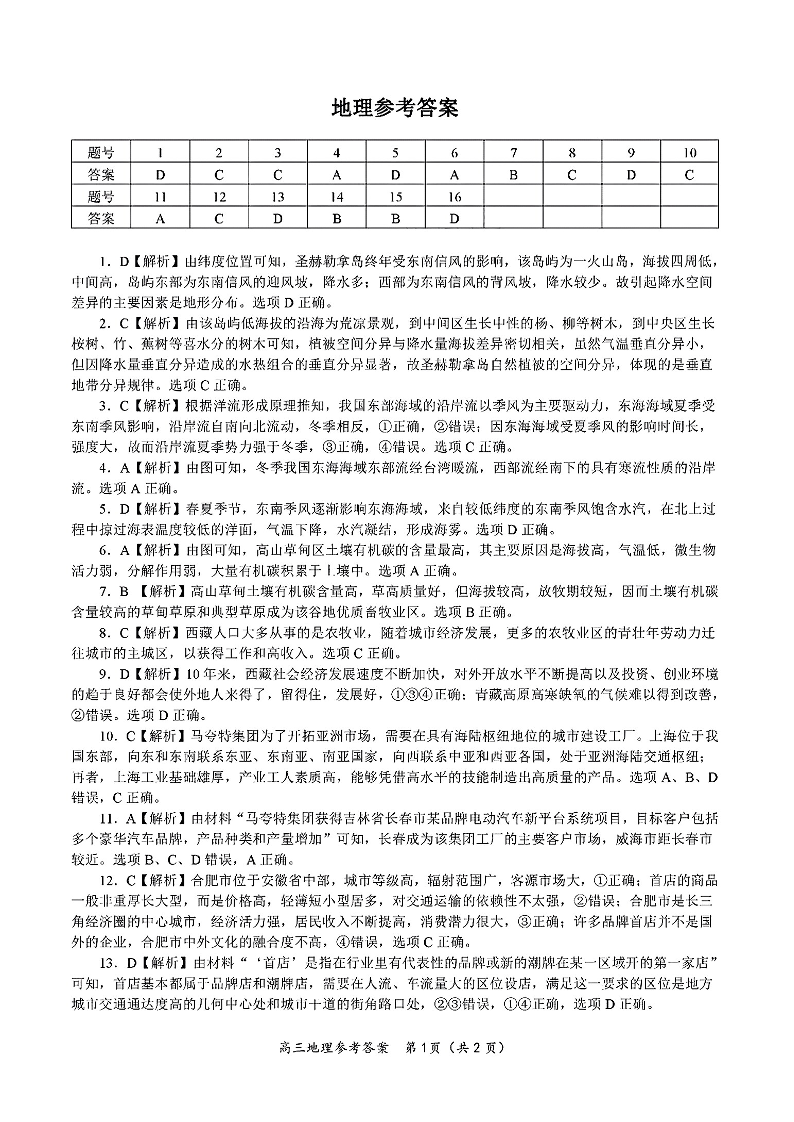 江西省九江市十校2023-2024学年高三第二次联考 地理答案
