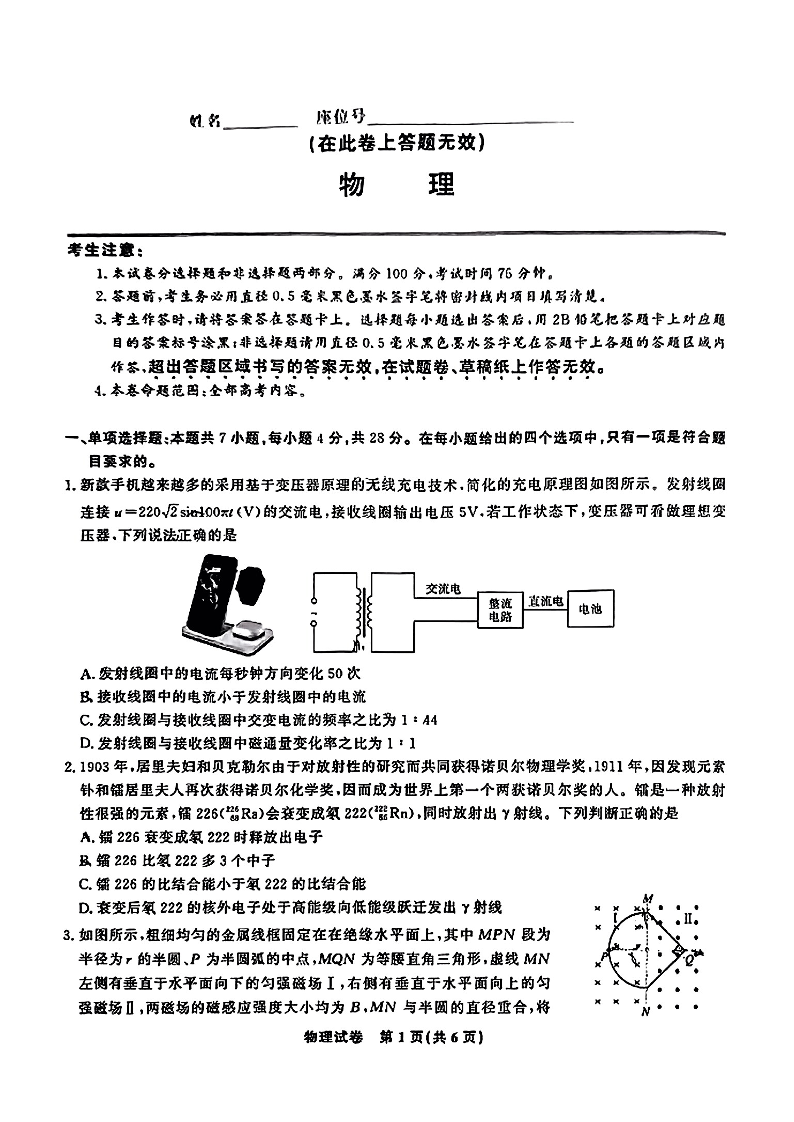 江西省九江市十校2023-2024学年高三第二次联考 物理