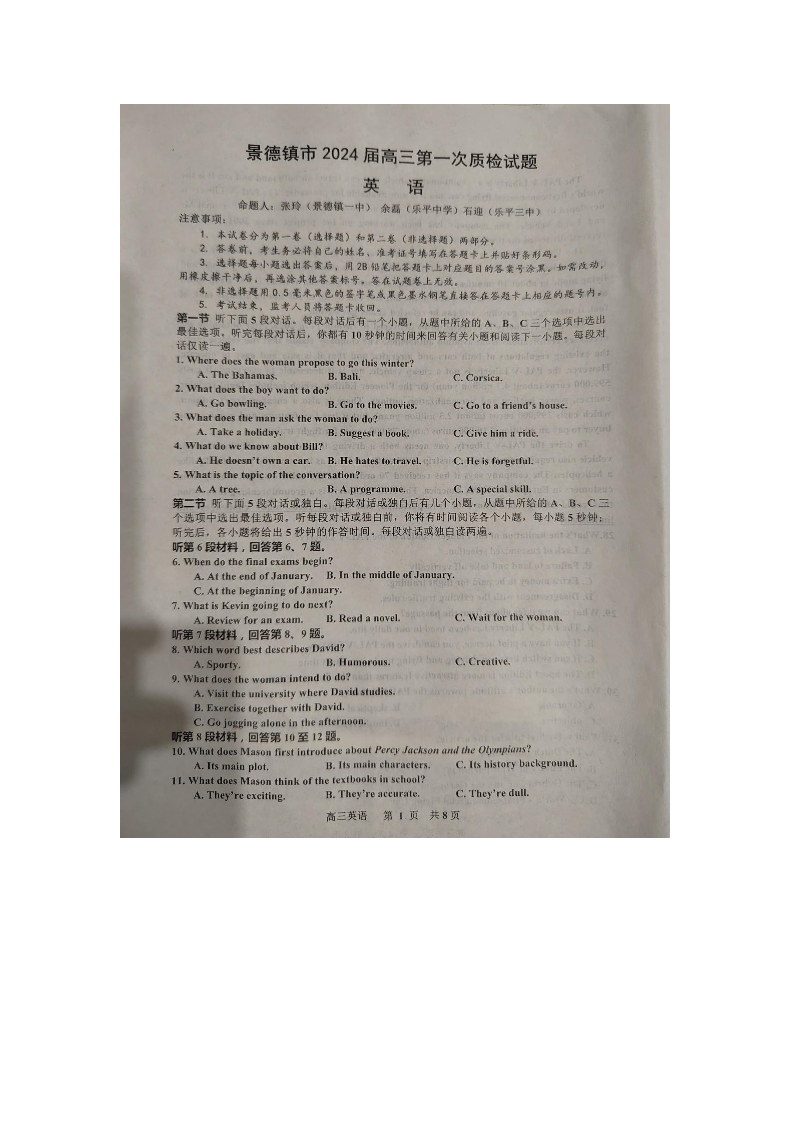 江西省景德镇市2023-2024学年高三上学期第一次质量检测 英语