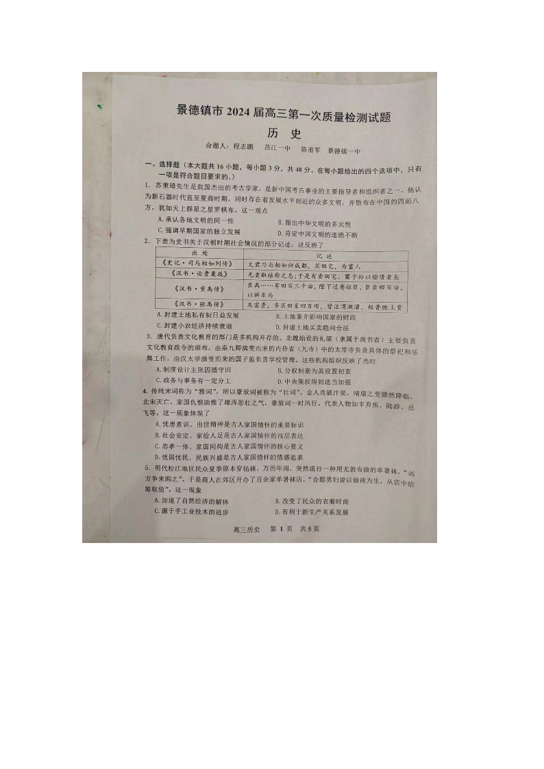 江西省景德镇市2023-2024学年高三上学期第一次质量检测 历史