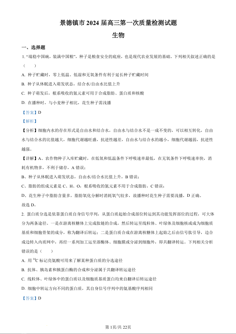 江西省景德镇市2023-2024学年高三上学期第一次质量检测 生物答案