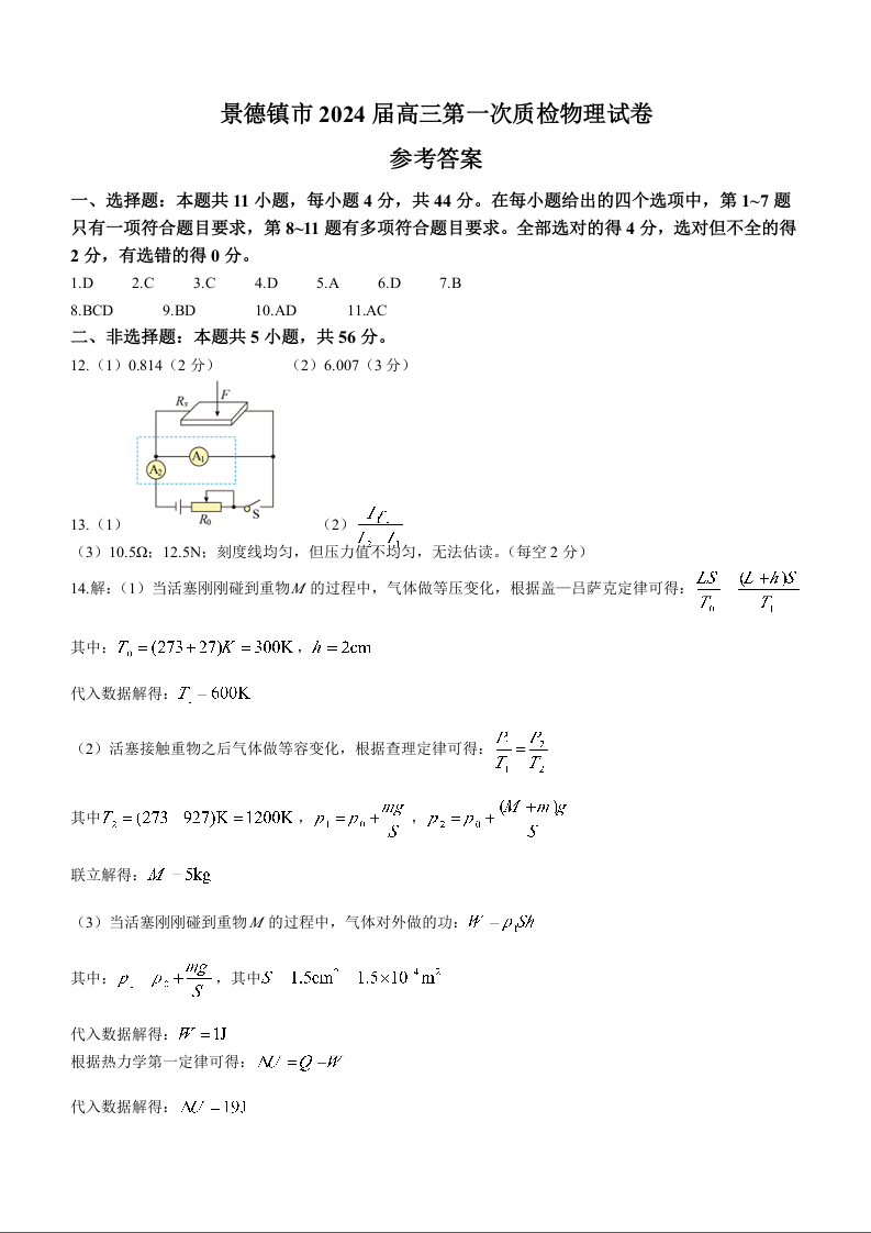 江西省景德镇市2023-2024学年高三上学期第一次质量检测 物理答案