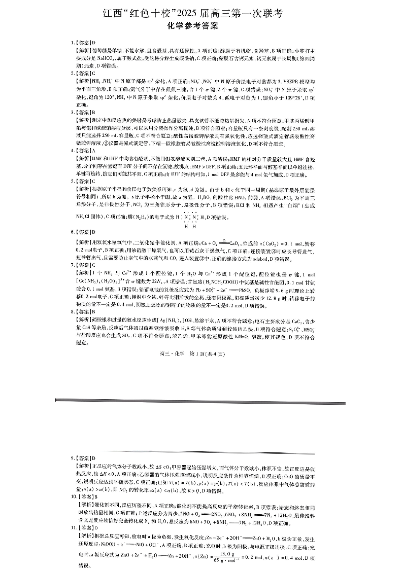江西省红色十校2025届高三上学期第一次联考+化学答案