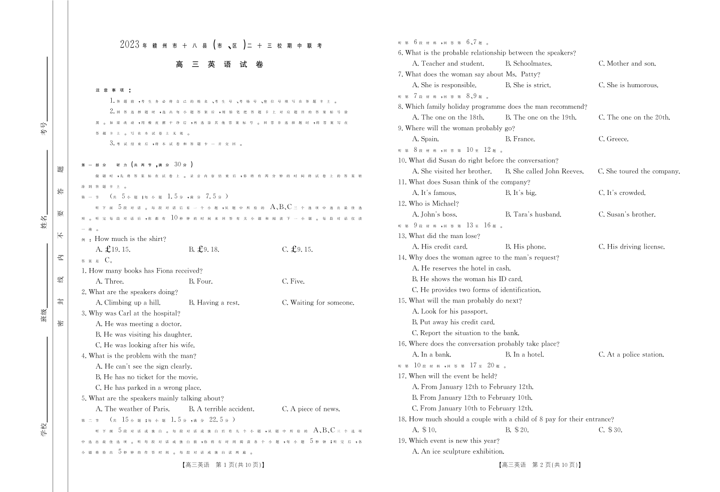 江西省赣州市十八县二十三校2023-2024学年高三上学期期中联考 英语