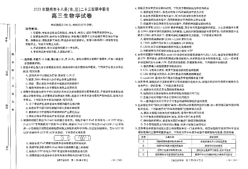 江西省赣州市十八县二十三校2023-2024学年高三上学期期中联考 生物