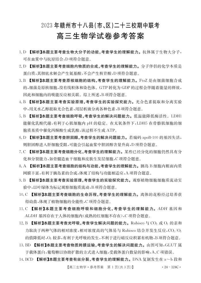 江西省赣州市十八县二十三校2023-2024学年高三上学期期中联考 生物答案