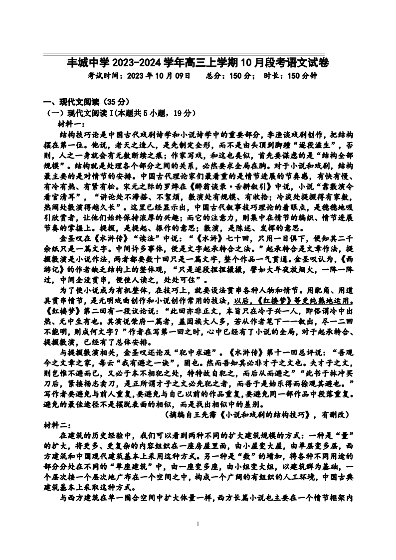 丰城中学2023-2024学年上学期高三第一次段考 语文