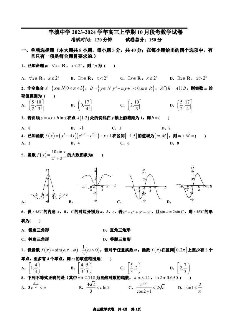 丰城中学2023-2024学年上学期高三第一次段考 数学