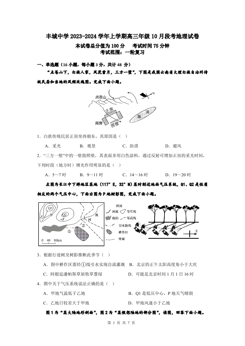 丰城中学2023-2024学年上学期高三第一次段考 地理