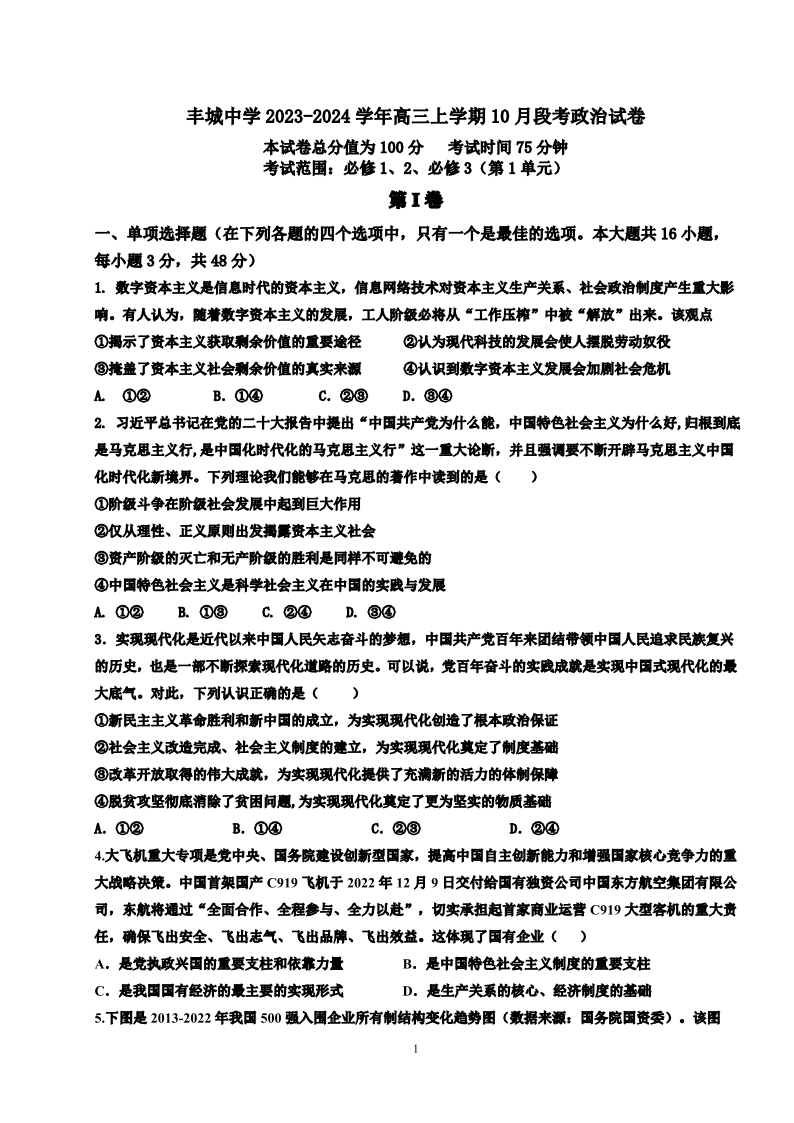 丰城中学2023-2024学年上学期高三第一次段考 政治