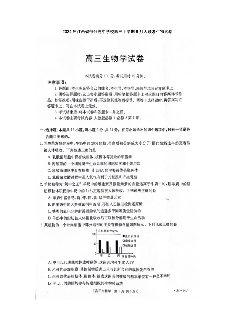 江西省部分高中学校2024届高三9月大联考 生物试卷
