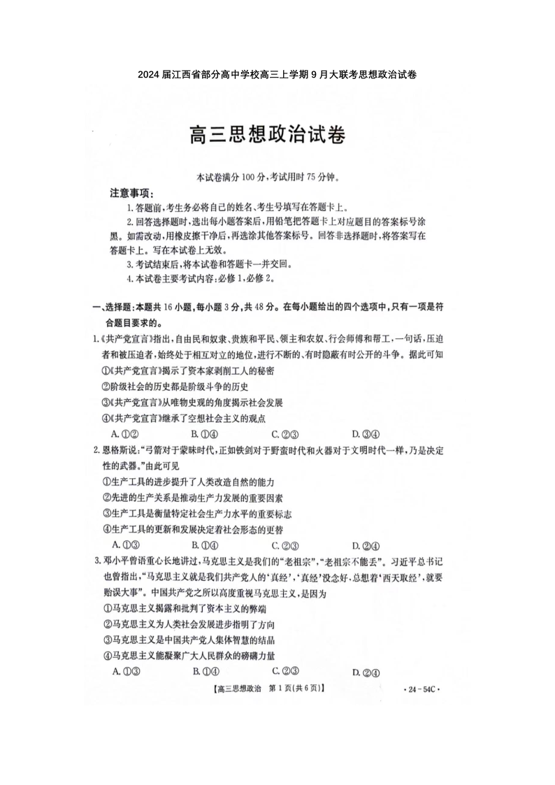 江西省部分高中学校2024届高三9月大联考 政治试卷