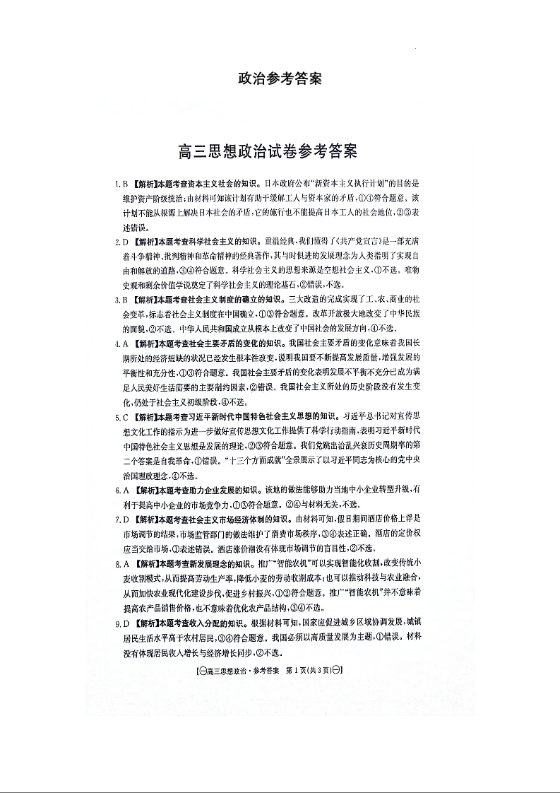 江西省部分高中学校2023-2024学年高三上学期10月联考 政治参考答案