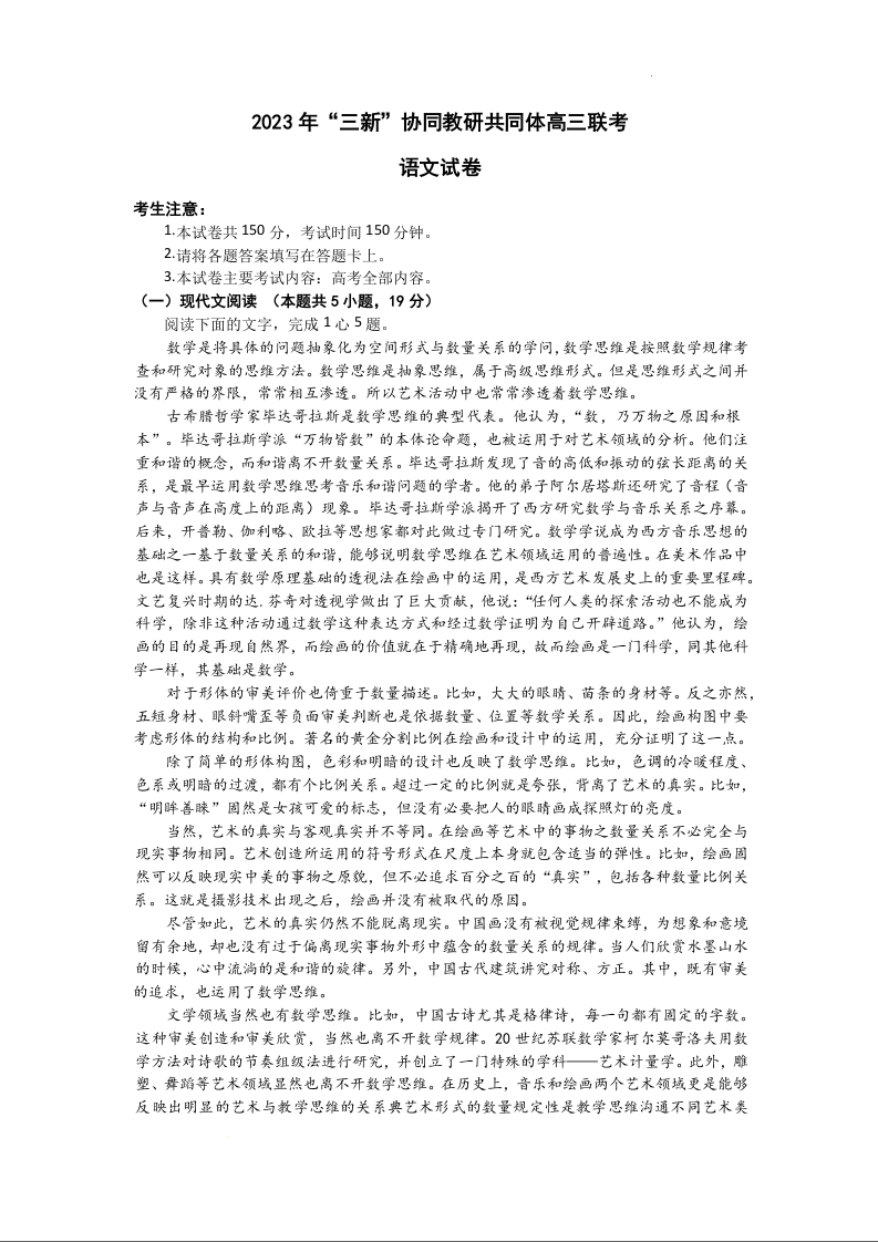 江西省“三新”协同教研共同体2023-2024学年高三上学期12月联考 语文