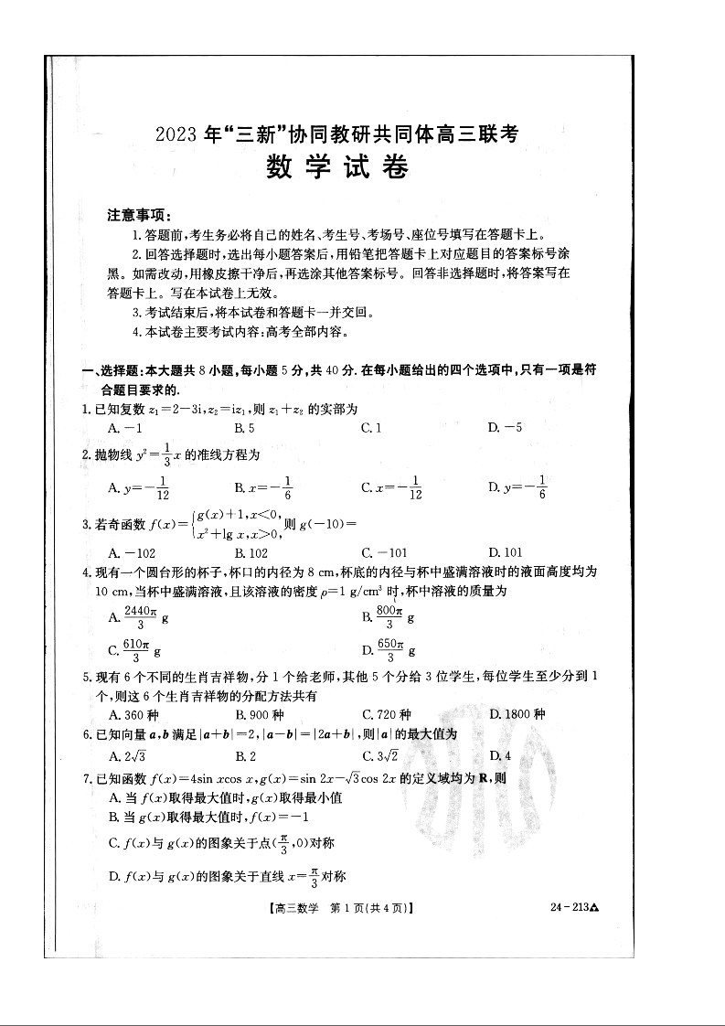 江西省“三新”协同教研共同体2023-2024学年高三上学期12月联考 数学