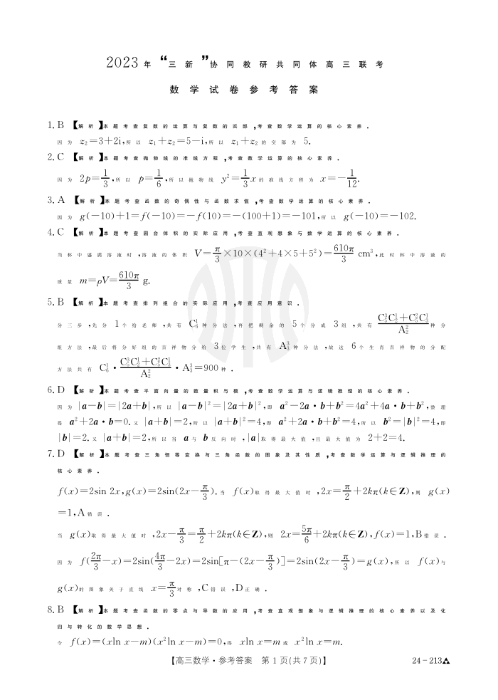 江西省“三新”协同教研共同体2023-2024学年高三上学期12月联考 数学答案