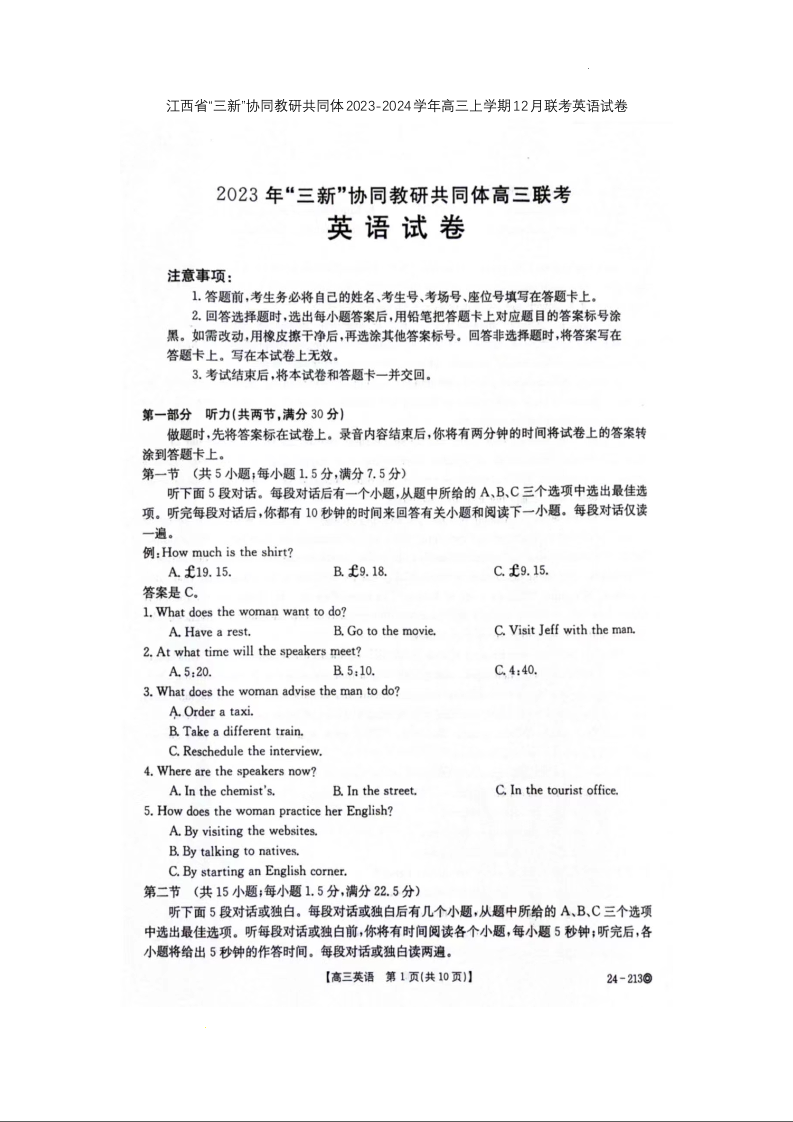 江西省“三新”协同教研共同体2023-2024学年高三上学期12月联考 英语