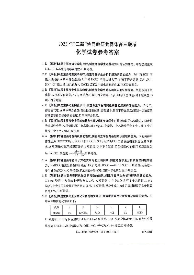 江西省“三新”协同教研共同体2023-2024学年高三上学期12月联考 化学答案