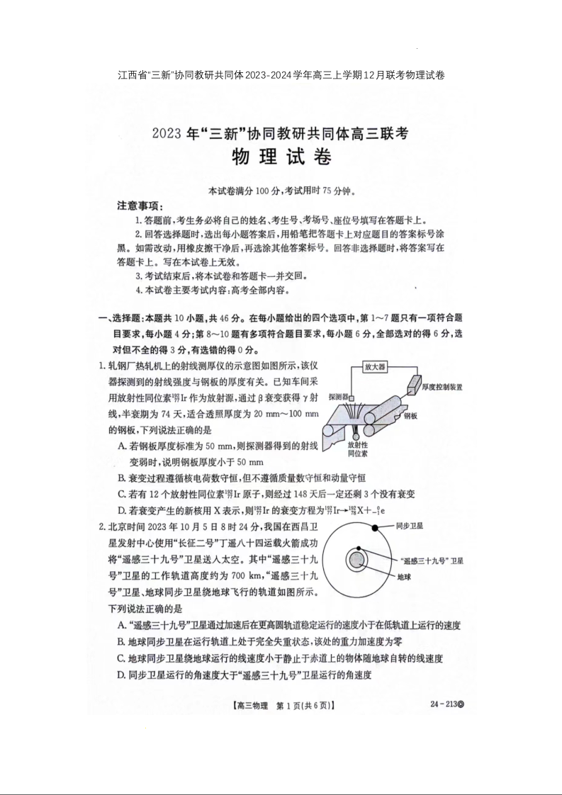 江西省“三新”协同教研共同体2023-2024学年高三上学期12月联考 物理