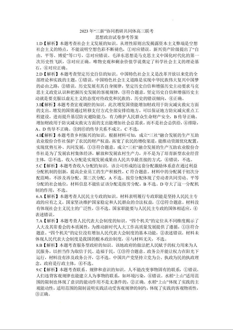 江西省“三新”协同教研共同体2023-2024学年高三上学期12月联考 政治答案