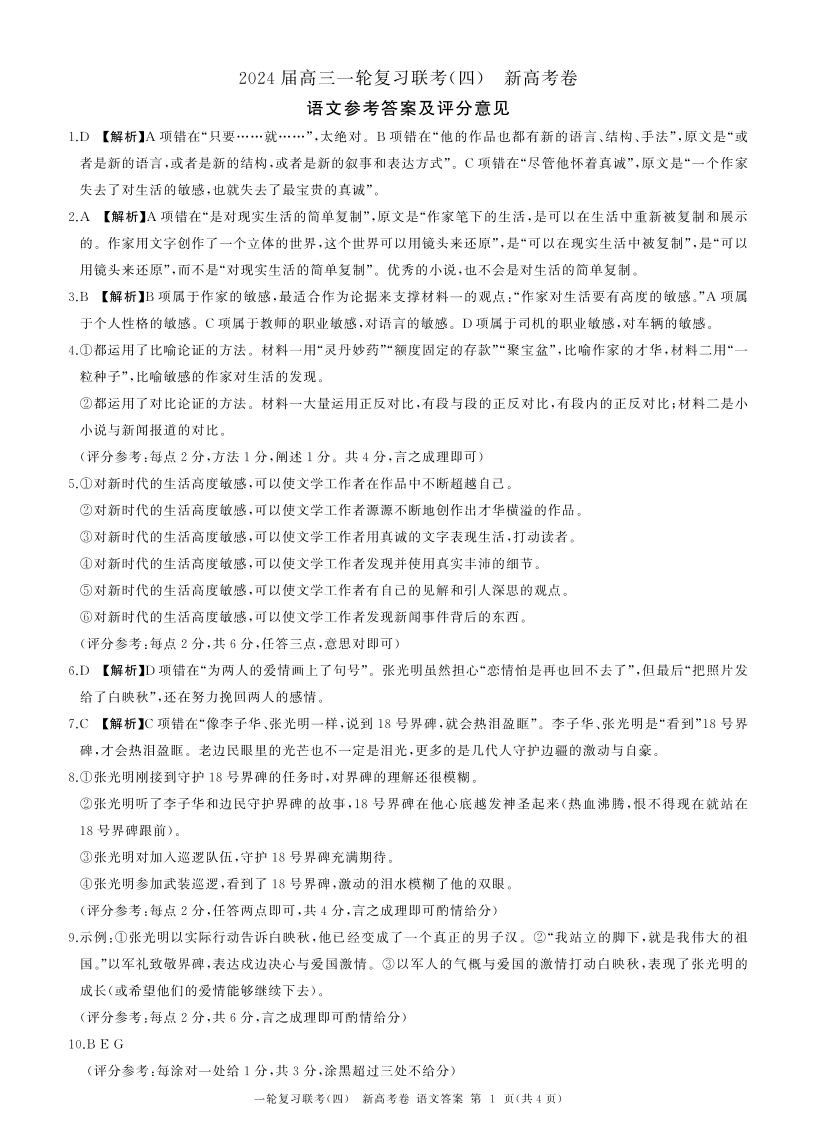 百师联盟2023-2024学年高三上学期一轮复习联考(四) 语文答案