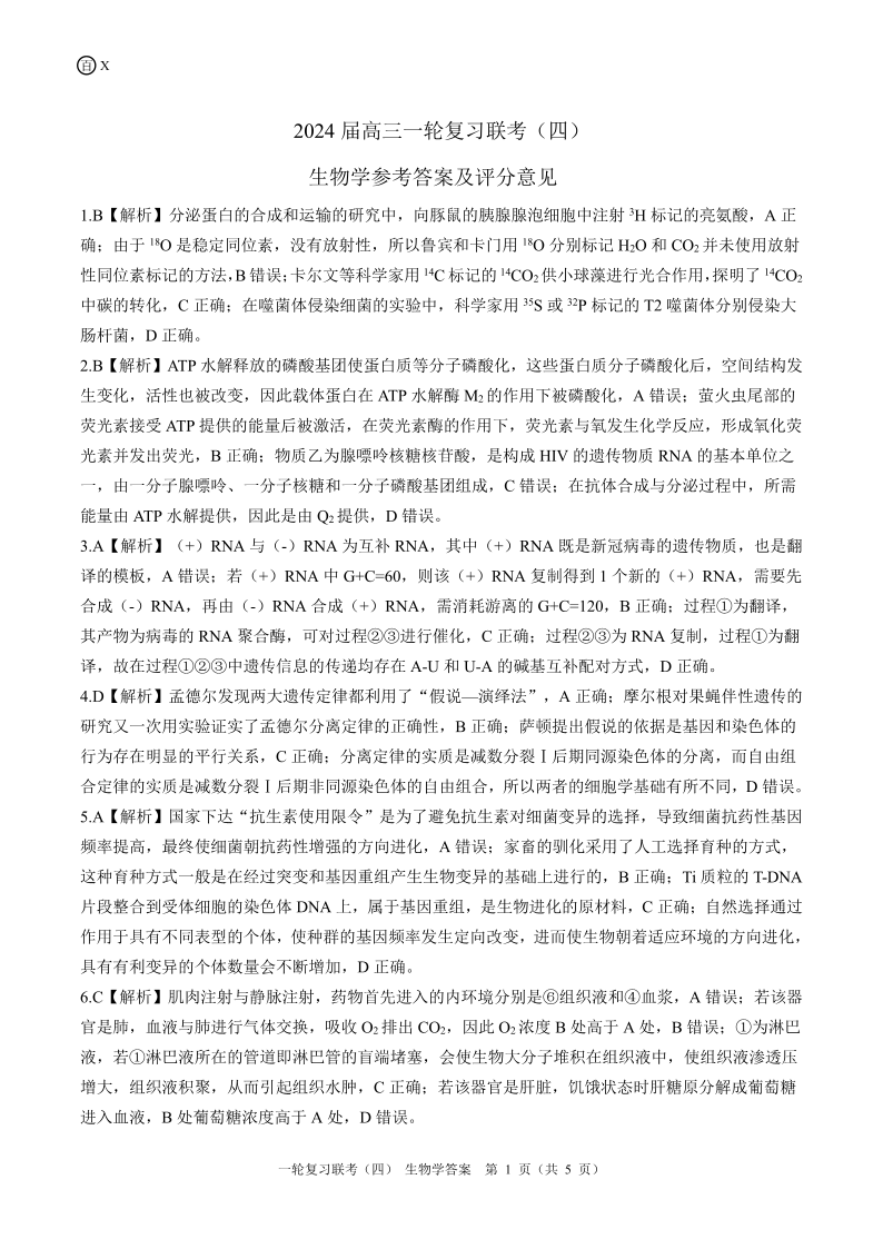 百师联盟2023-2024学年高三上学期一轮复习联考(四) 生物答案